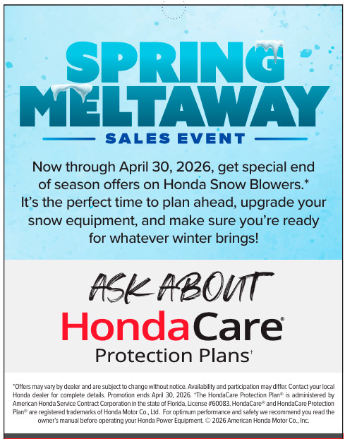 Now through April 30, 2026, get special end of season offers on Honda Snow Blowers.* It's the perfect time to plan ahead, upgrade your snow equipment, and make sure you're ready for whatever winter brings!